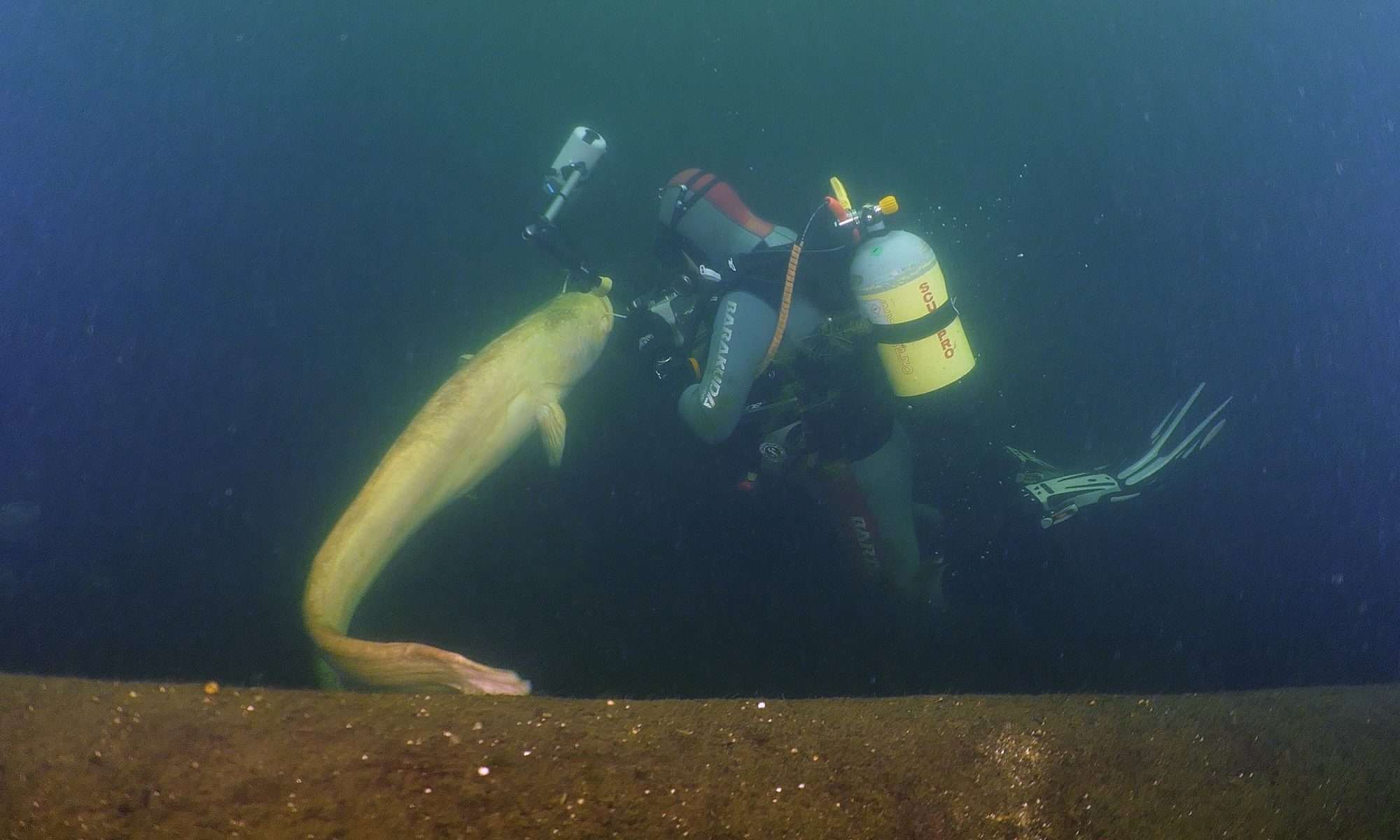 Der Europäische Wels gilt als größter Süßwasserfisch Europas. Er ist vor allem in der Dämmerung und nachts aktiv und ernährt sich überwiegend von lebenden oder toten Fischen, gelegentlich auch von Wasservögeln. Trotz seiner Größe ist der Wels ein eher scheues Tier, umso erstaunlicher, dass Emma sich immer wieder bei uns Tauchern blicken lässt, und selbst bei längeren Foto und Filmaufnamen nicht die Ruhe verliert.